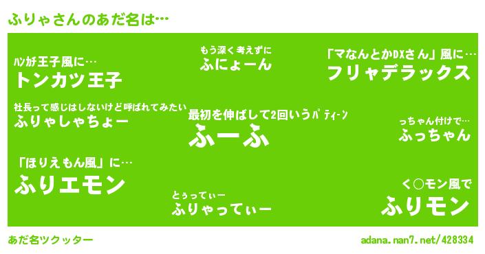 | 男性向けラノベタイトル風あだ名 | 『フリャアートオンライン』『魔弾の王とふりゃ』『フリャスレイヤー』 |