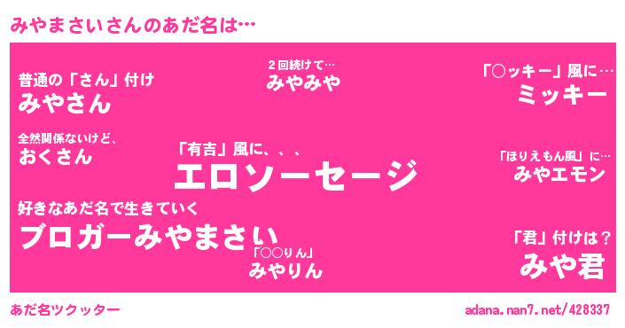 | ヒーロー風カッコイイあだ名 | 『仮面ミヤダー』『ウルトラ戦士ミヤマサイ』『幻影騎士ミヤ』 |