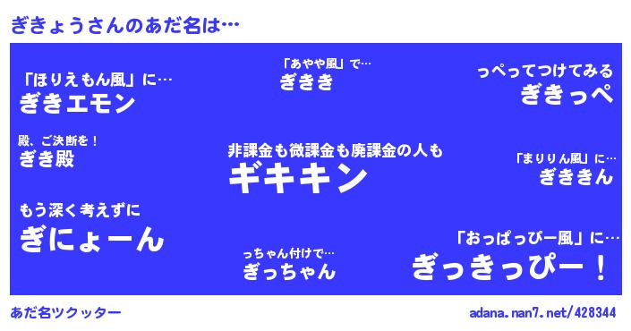 | ヘコむあだ名 | 『ぎきふぇ~』『豆乳』『ぎきぷりん』『ぎきょう(小並感)』 |