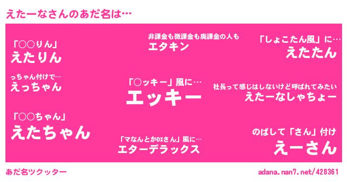 | ヒーロー風カッコイイあだ名 | 『究極戦士エターナ』『友情の使者えたーな』『幻影騎士エタ』 |