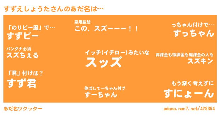 | ヘコむあだ名 | 『すずふぇ~』『豆乳』『すずぷりん』『すずえしょうた(小並感)』 |