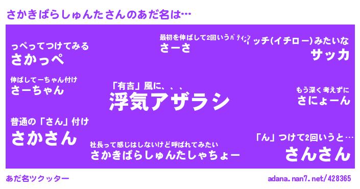 | 意味不明あだ名 | 『自称さかきばらしゅんた』『永久保存さかきばらしゅんた』 |