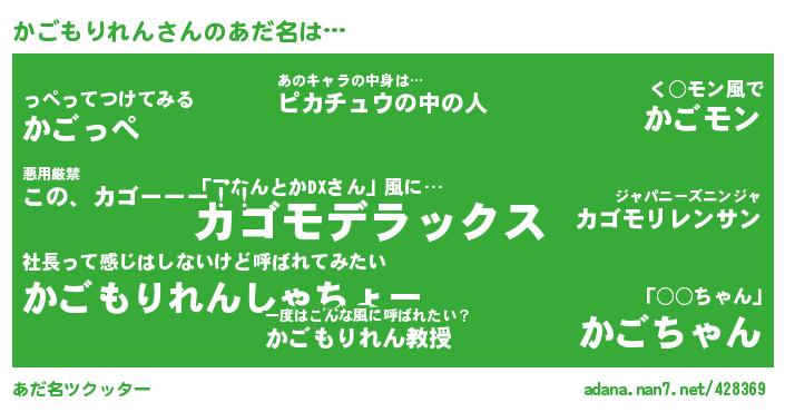 | 意味不明あだ名 | 『自称かごもりれん』『永久保存かごもりれん』『もやし科かごもりれん属』 |