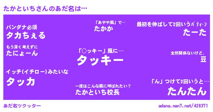 | ヘコむあだ名 | 『たかふぇ~』『豆乳』『たかぷりん』『たかといち(小並感)』 |