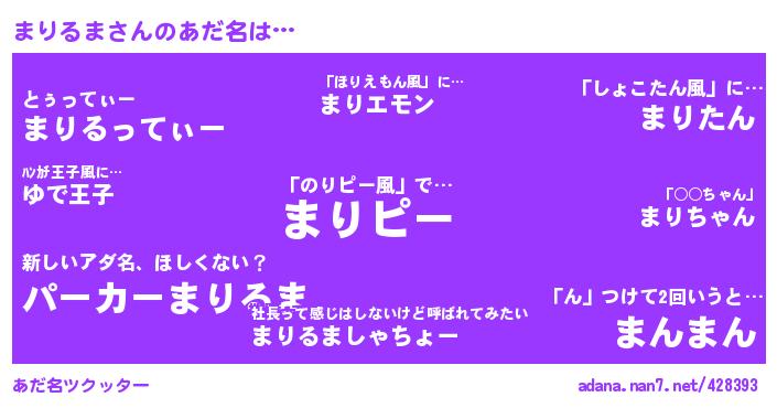 | ヒーロー風カッコイイあだ名 | 『天空の使者まりるま』『ネオマリルマ』『ウルトラまりるまマン』 |