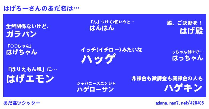 | ポケモン風あだ名 | 『ハゲゴンZ』『ハゲキング』『ハーゲイ』『メロハッゲ』 |