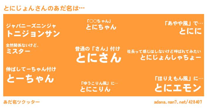 | ヒーロー風カッコイイあだ名 | 『仮面トニダー』『ネオトニジョン』『ウルトラとにじょんマン』 |