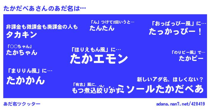| 欧米人風あだ名 | 『ダニエルたかだべあ』『たかだべあクリステル』『マイケルたかだべあ』 |