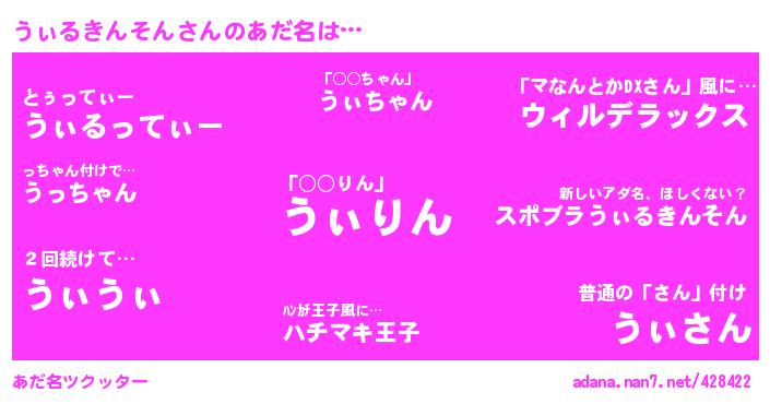 | ヘコむあだ名 | 『うぃふぇ~』『豆乳』『うぃぷりん』『うぃるきんそん(小並感)』 |