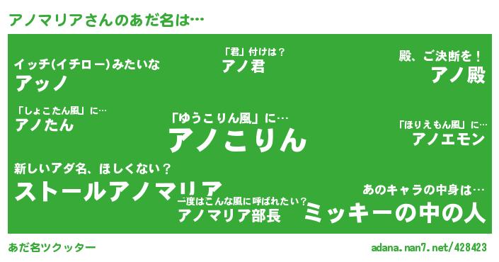 | 男性向けラノベタイトル風あだ名 | 『この素晴らしい世界にアノマリアを!』『冴えないアノマリアの育てかた』 |