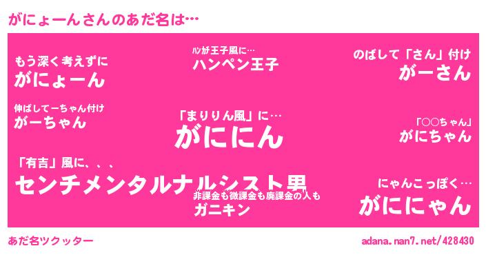 | ヘコむあだ名 | 『がにふぇ~』『豆乳』『がにぷりん』『がにょーん(小並感)』 |