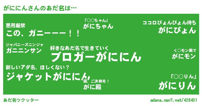 | 欧米人風あだ名 | 『がににんクリステル』『アンジェラ・がににん』『ケンブリッジがににん』 |