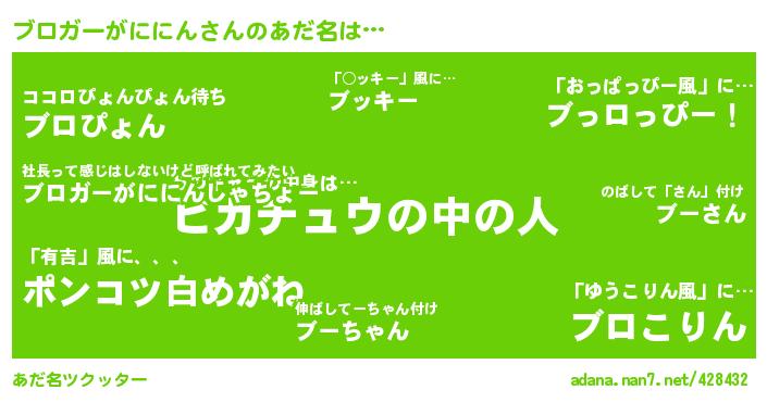 | ポケモン風あだ名 | 『メロブッロ』『ブックウザ』『ゼニブロ』『ヒブロガーガニニン』 |