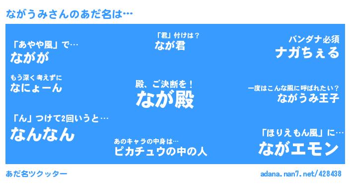 | ヘコむあだ名 | 『ながふぇ~』『豆乳』『ながぷりん』『ながうみ(小並感)』 |