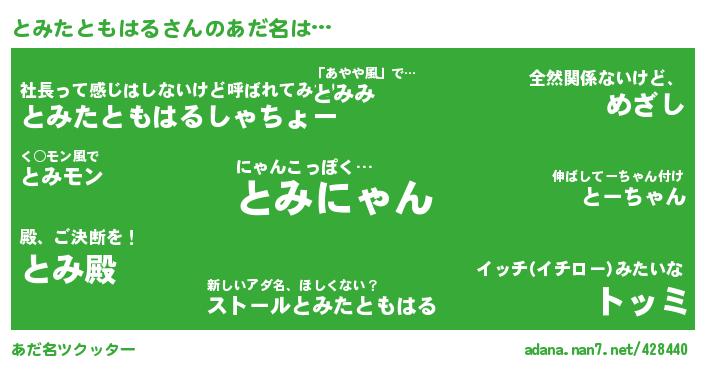 | ポケモン風あだ名 | 『トミゴンZ』『ゼニトミ』『ヒトミタトモハル』『トミキング』 |