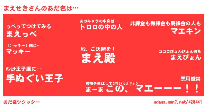 | ヒーロー風カッコイイあだ名 | 『ネオマエセキ』『ウルトラまえせきマン』『仮面マエダー』 |