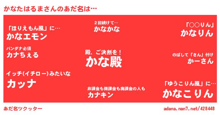| ヘコむあだ名 | 『かなふぇ~』『豆乳』『かなぷりん』『かなたはるま(小並感)』 |