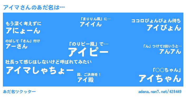 | 意味不明あだ名 | 『永久保存アイマ』『住所不定無職アイマ(79歳)』『アイマフォーエバー』 |