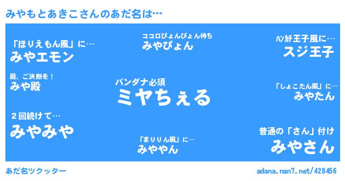 | ポケモン風あだ名 | 『ヒミヤモトアキコ』『ミックウザ』『ミヤモダネ』『ミーヤイ』 |