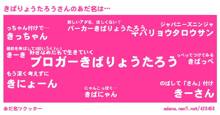 | ヒーロー風カッコイイあだ名 | 『天空の使者きばりょうたろう』『ネオキバリョウタロウ』『仮面キバダー』 |