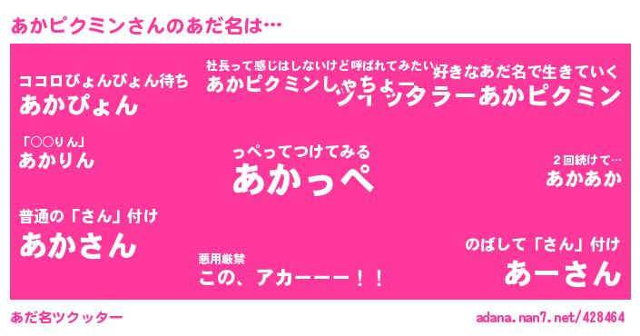 | ヘコむあだ名 | 『あかふぇ~』『豆乳』『あかぷりん』『あかピクミン(小並感)』 |
