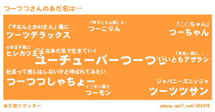 | 男性向けラノベタイトル風あだ名 | 『ツーツツアートオンライン』『この素晴らしい世界につーつつを!』 |