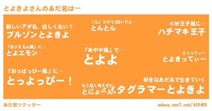 | 男性向けラノベタイトル風あだ名 | 『とよきよ~年齢イコール彼女いない歴の魔法使い~』 |