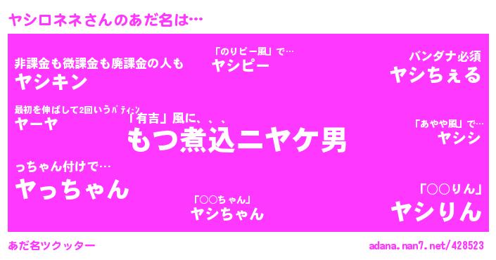 | ポケモン風あだ名 | 『ヤックウザ』『ヒヤシロネネ』『ヤシセウス』『ヤシゴンZ』 |