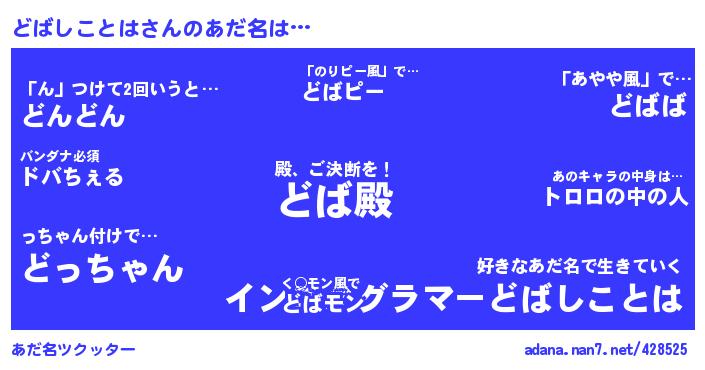 | ヘコむあだ名 | 『どばふぇ~』『豆乳』『どばぷりん』『どばしことは(小並感)』 |