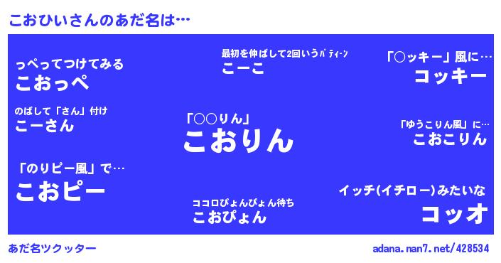 | ポケモン風あだ名 | 『ゼニコオ』『メロコッオ』『コオチュウ』『コオゴンZ』 |