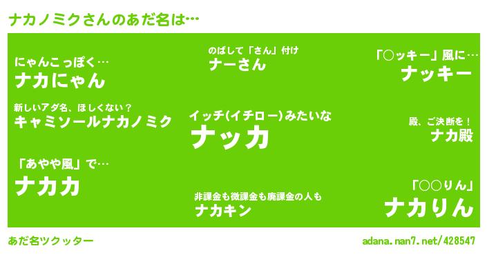 | 男性向けラノベタイトル風あだ名 | 『Re:ナカノミクから始める異世界生活』『魔弾の王とナカノミク』 |