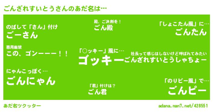 | ヘコむあだ名 | 『ごんふぇ~』『豆乳』『ごんぷりん』『ごんざれすいとう(小並感)』 |