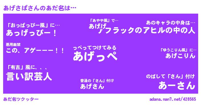 | ヘコむあだ名 | 『あげふぇ~』『豆乳』『あげぷりん』『あげさば(小並感)』 |