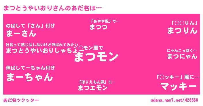 | 欧米人風あだ名 | 『まつとうやいおり・ステッグマイヤー』『ケンブリッジまつとうやいおり』 |