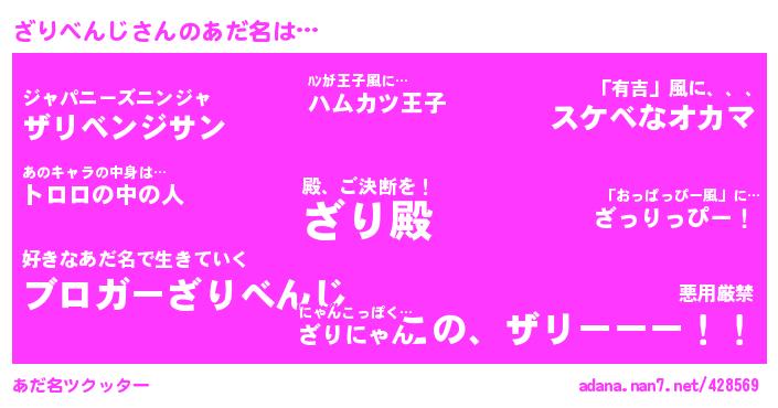 | 男性向けラノベタイトル風あだ名 | 『ノーゲーム・ノーザリベンジ』『はたらくざりべんじさま!』 |