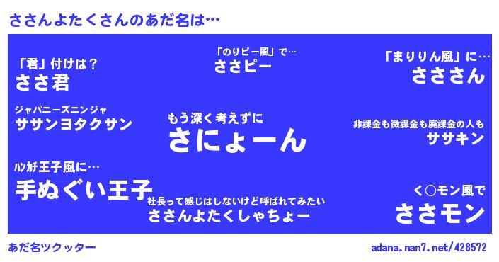 | ヘコむあだ名 | 『ささふぇ~』『豆乳』『ささぷりん』『ささんよたく(小並感)』 |