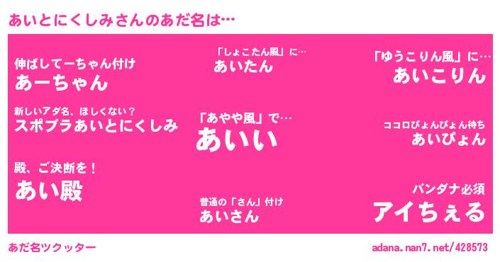 | ヘコむあだ名 | 『あいふぇ~』『豆乳』『あいぷりん』『あいとにくしみ(小並感)』 |