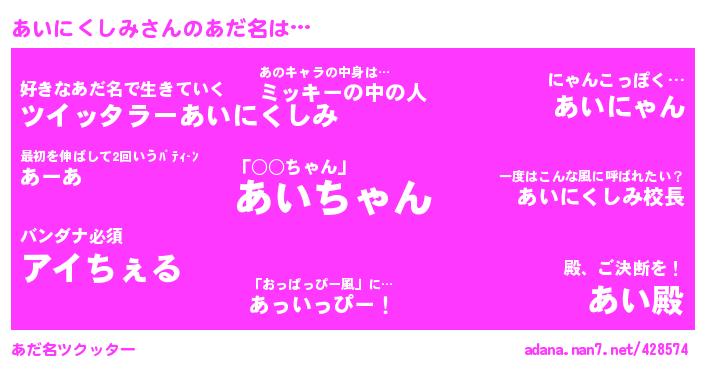 | ヒーロー風カッコイイあだ名 | 『ウルトラあいにくしみマン』『スーパーアイニクシミ』『仮面アイダー』 |