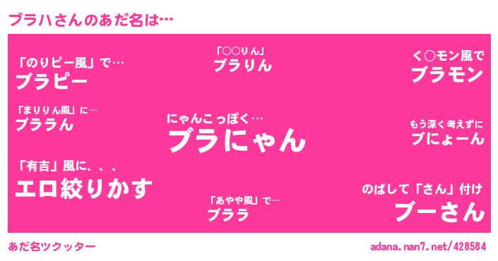 | 恥ずかしいあだ名 | 『ブラハデラックス』『ブラちん』『ブラっちょ』『ブラリンリン』 |