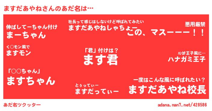 | ヘコむあだ名 | 『ますふぇ~』『豆乳』『ますぷりん』『ますだあやね(小並感)』 |