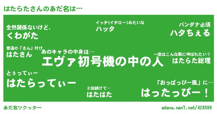 | ヘコむあだ名 | 『はたふぇ~』『豆乳』『はたぷりん』『はたらた(小並感)』 |