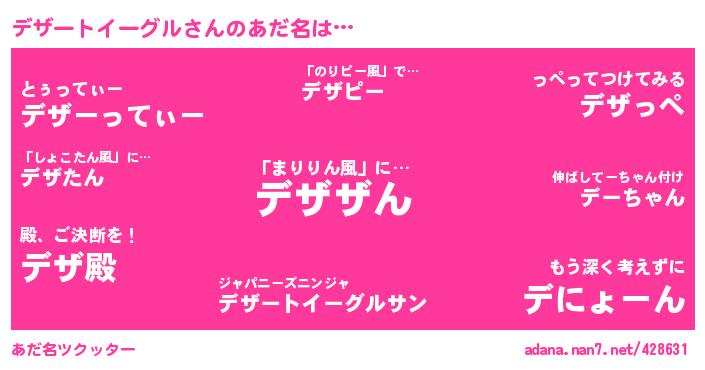 | ヒーロー風カッコイイあだ名 | 『ネオデザートイーグル』『友情の使者デザートイーグル』『暗黒騎士デザ』 |