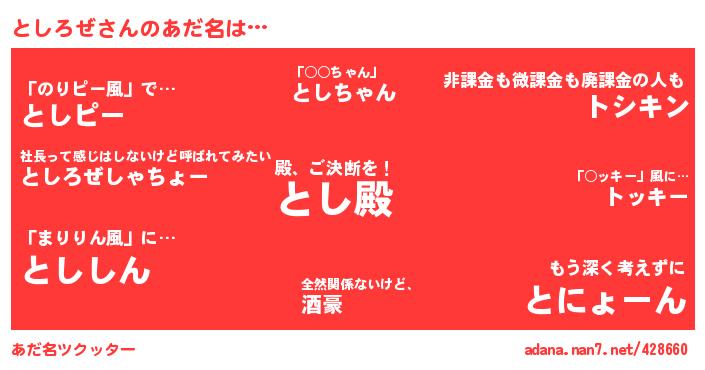 | 意味不明あだ名 | 『自称としろぜ』『眠気覚ましガムとしろぜ味』『永久保存としろぜ』 |