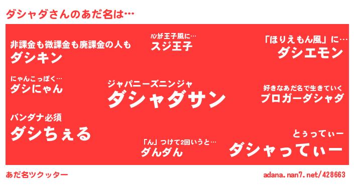 | 男性向けラノベタイトル風あだ名 | 『ノーゲーム・ノーダシャダ』『はたらくダシャダさま!』 |
