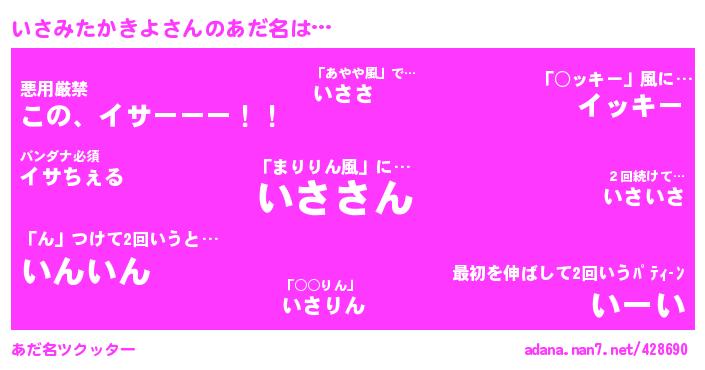 | ヒーロー風カッコイイあだ名 | 『仮面イサダー』『魔戒騎士イサ』『ウルトラいさみたかきよマン』 |