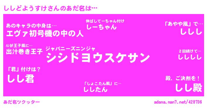 | ヘコむあだ名 | 『ししふぇ~』『豆乳』『ししぷりん』『ししどようすけ(小並感)』 |