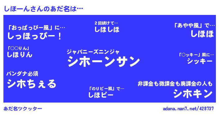 | 意味不明あだ名 | 『永久保存しほーん』『自称しほーん』『とにかく怪しいしほーん』 |