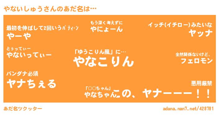 | ヘコむあだ名 | 『やなふぇ~』『豆乳』『やなぷりん』『やないしゅう(小並感)』 |
