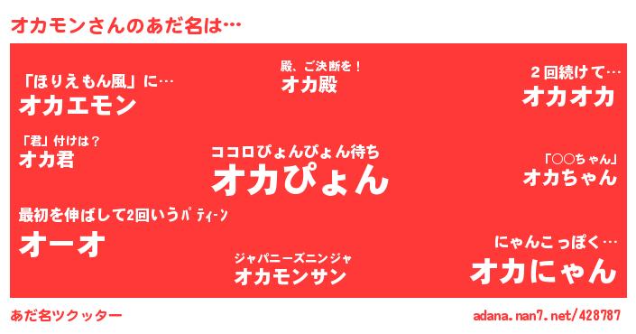 | 意味不明あだ名 | 『永久保存オカモン』『眠気覚ましガムオカモン味』『なめこ科オカモン属』 |