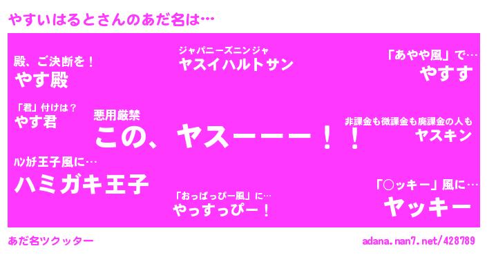 | ヘコむあだ名 | 『やすふぇ~』『豆乳』『やすぷりん』『やすいはると(小並感)』 |